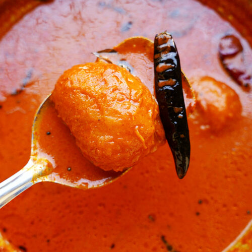 - For the seasoning, heat oil in a small pan. Add mustard seeds and let them splutter. Then add curry leaves, Guntur dry chillies, and a pinch of hing (asafoetida). Mix well and pour this seasoning into the gravy.